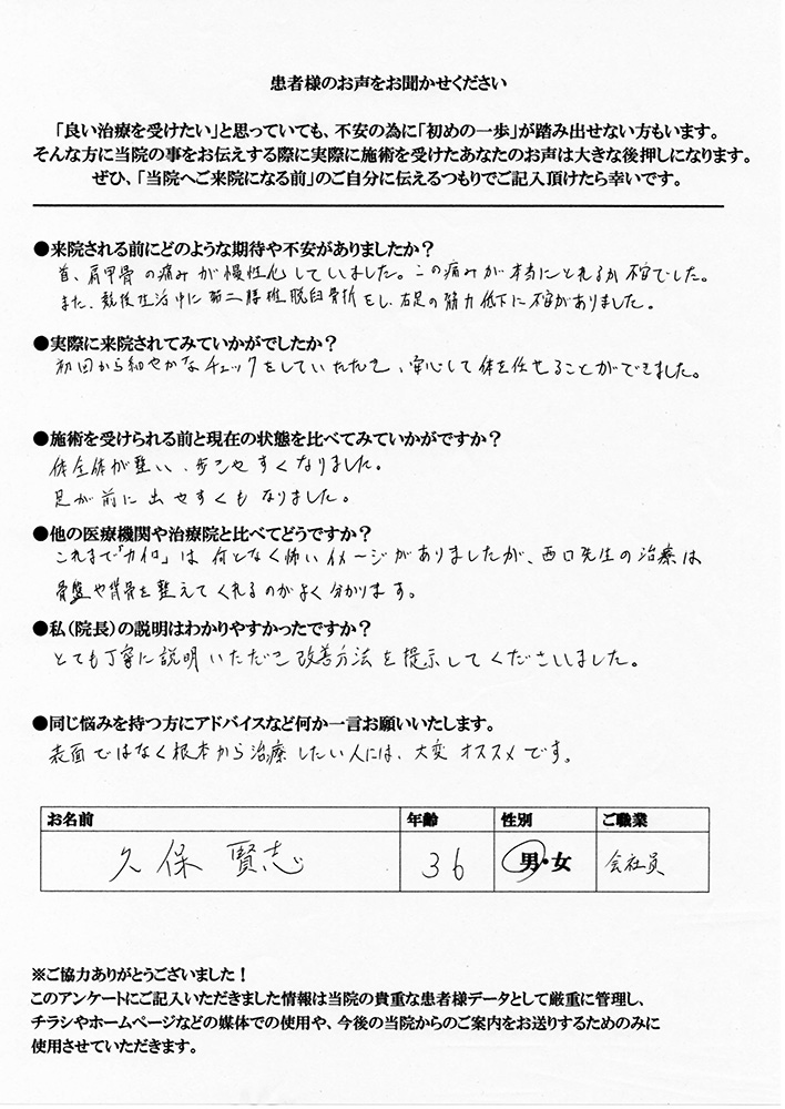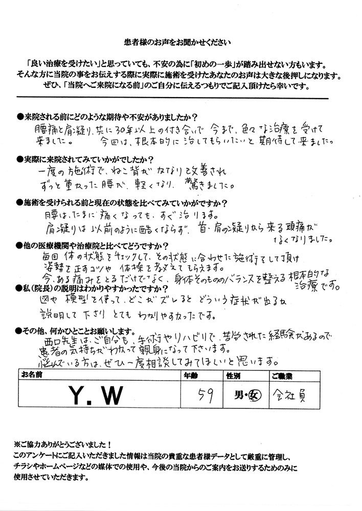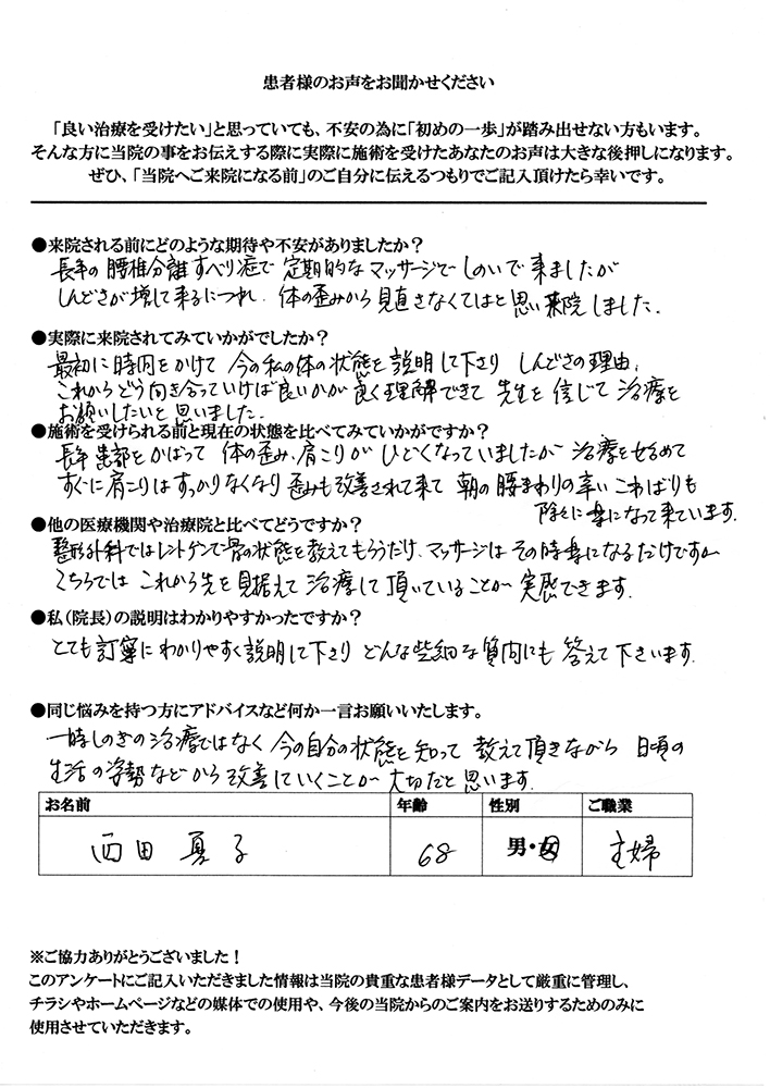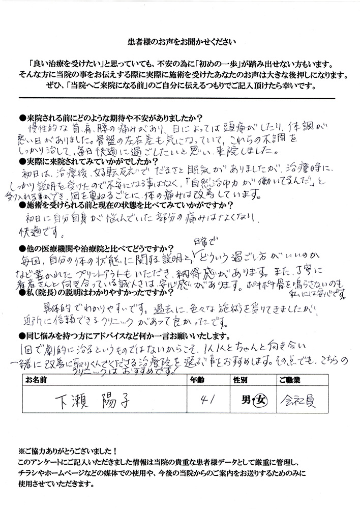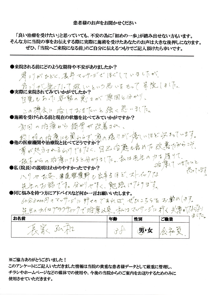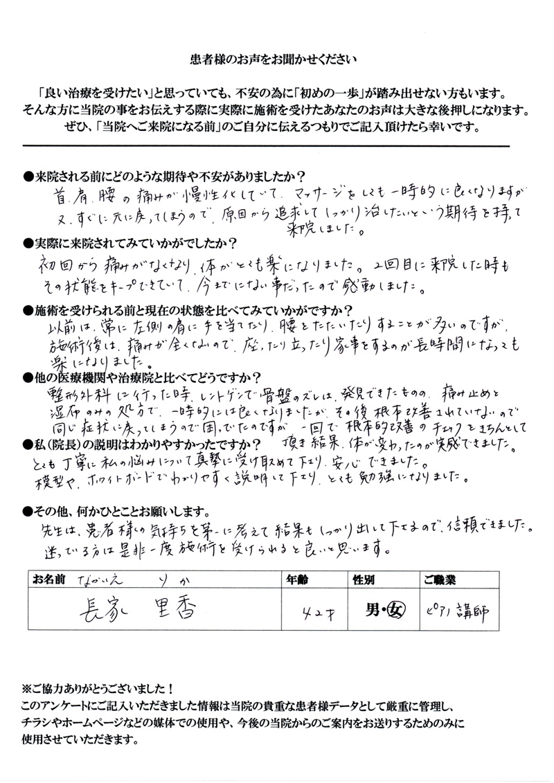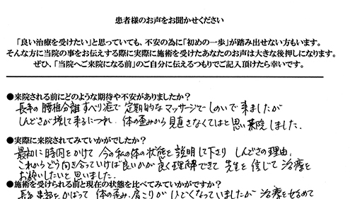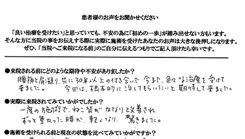 腰痛と肩こり、共に30年以上の付き合いで、今まで色々な治療を受けて来ました。今回は根本的に治してもらいたいと期待して来ました。