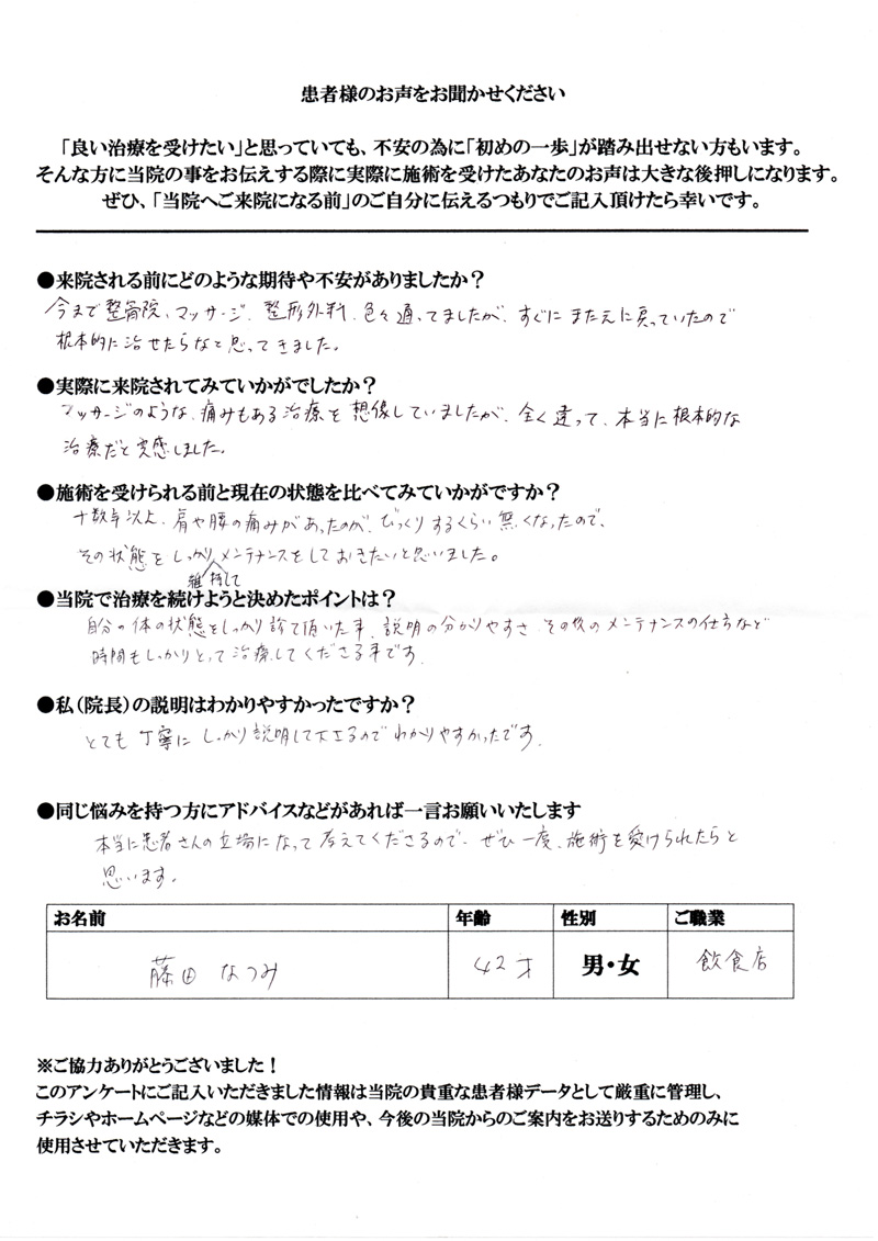 マッサージのような痛みもある治療を想像していましたが、全く違って本当に根本的な治療だと実感しました。