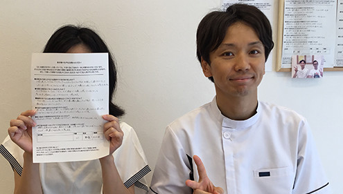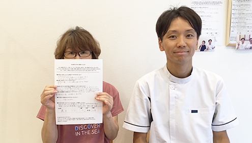 初回から痛みがなくなり、体がとても楽になりました。2回目に来院した時もその状態をキープできていて、今までにない事だったので感動しました。