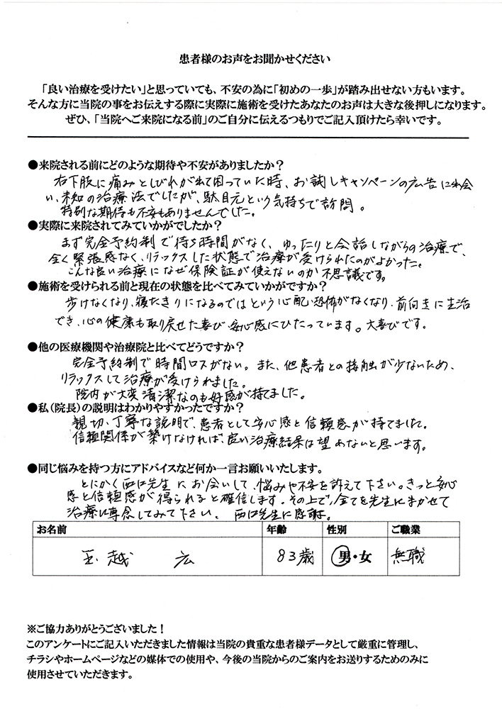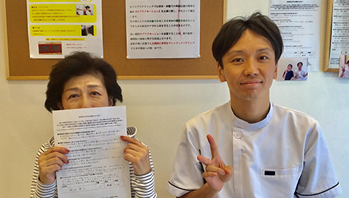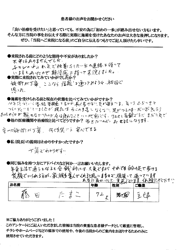 歩けなくなり、寝たきりになるのではという心配・恐怖がなくなり、前向きに生活でき、心の健康も取り戻せた喜び、安心感に浸っています。大喜びです。