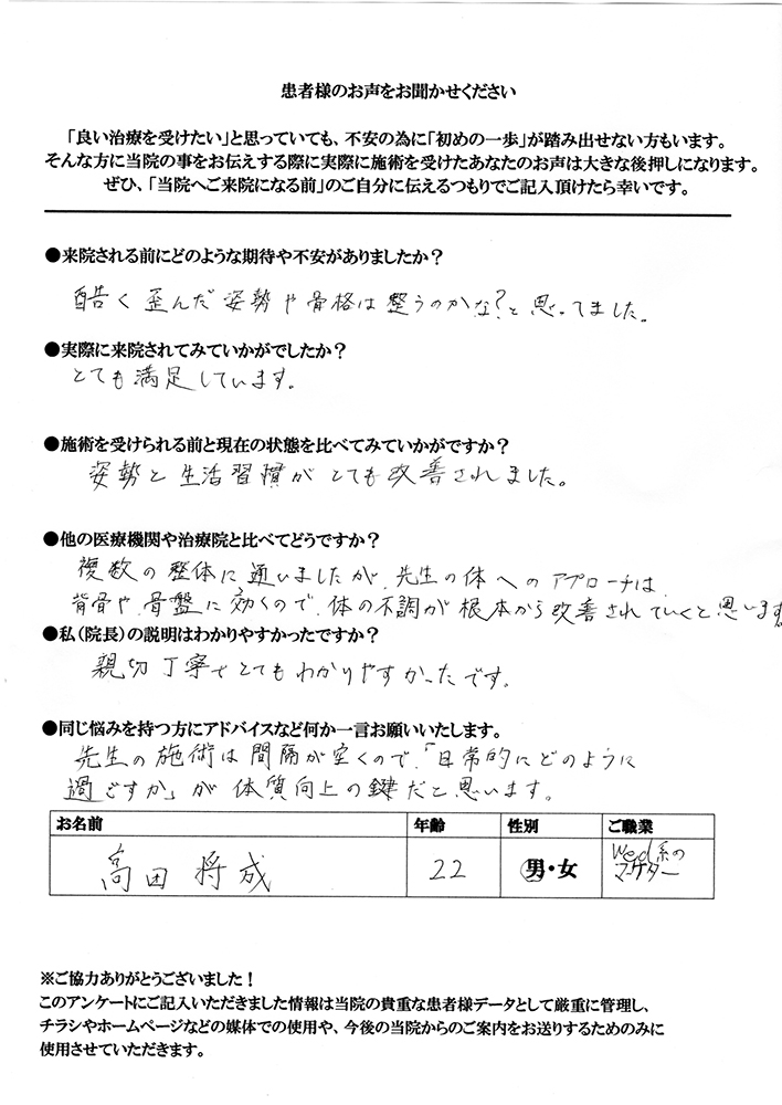 複数の整体に通いましたが、先生の体へのアプローチは背骨や骨盤に効くので、体の不調が根本から改善されていくと思います。