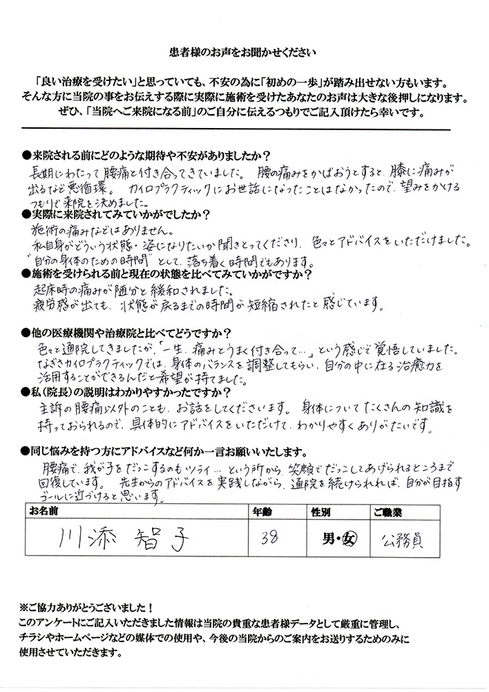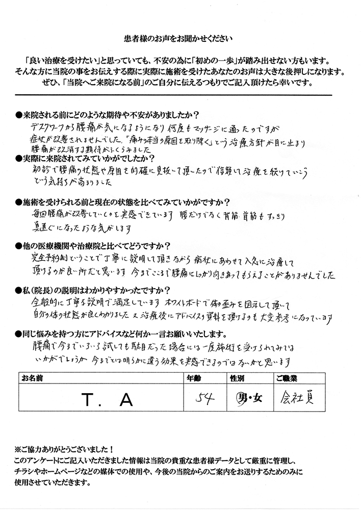 デスクワークから腰痛が気になるようになり、何度もマッサージに通ったのですが、症状が改善されませんでした。「痛みの本当の原因を取り除く」という治療方針が目に止まり腰痛が改善する期待が膨らみました。