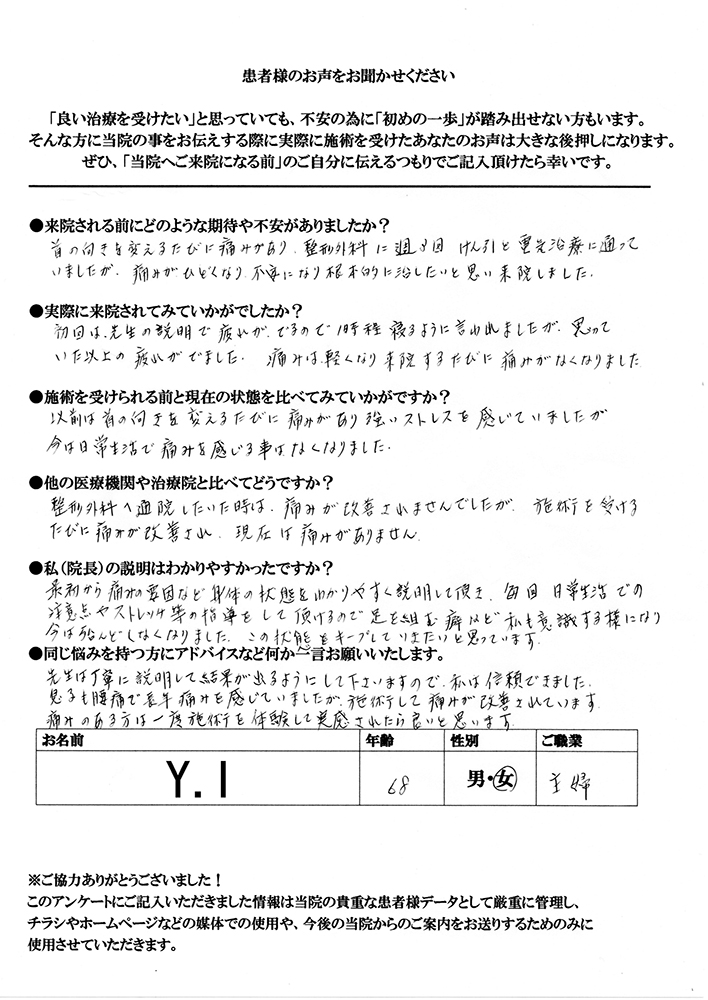 以前は首の向きを変えるたびに痛みがあり強いストレスを感じていましたが、今は日常生活で痛みを感じる事はなくなりました。