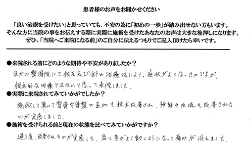 整形外科へ通院していた時は、痛みが改善されませんでしたが、施術を受けるたびに痛みが改善され、現在は痛みがありません。
