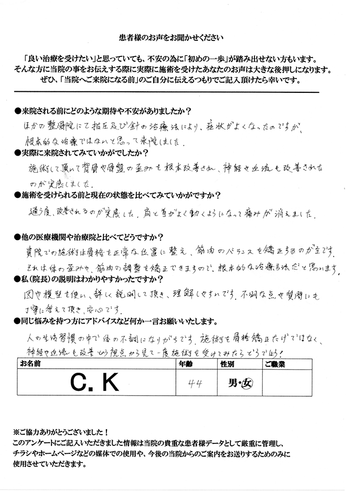 施術して頂いて背骨や骨盤の歪みが根本改善され、神経や血流も改善されたのが実感しました。