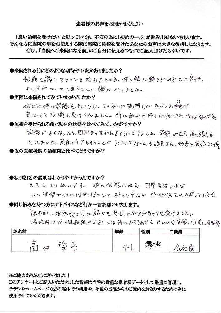 姿勢がよくなったと周囲から言われるようになりました。骨盤が立ち、肩の張りもとれました。足首のケアもすることでランニングフォームも改善され、効果を実感しています。