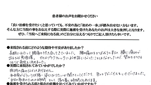 不安はありませんでした。チラシの中に本気で改善したい方の連絡を待っていますとあったので、期待感を持って来院しました。